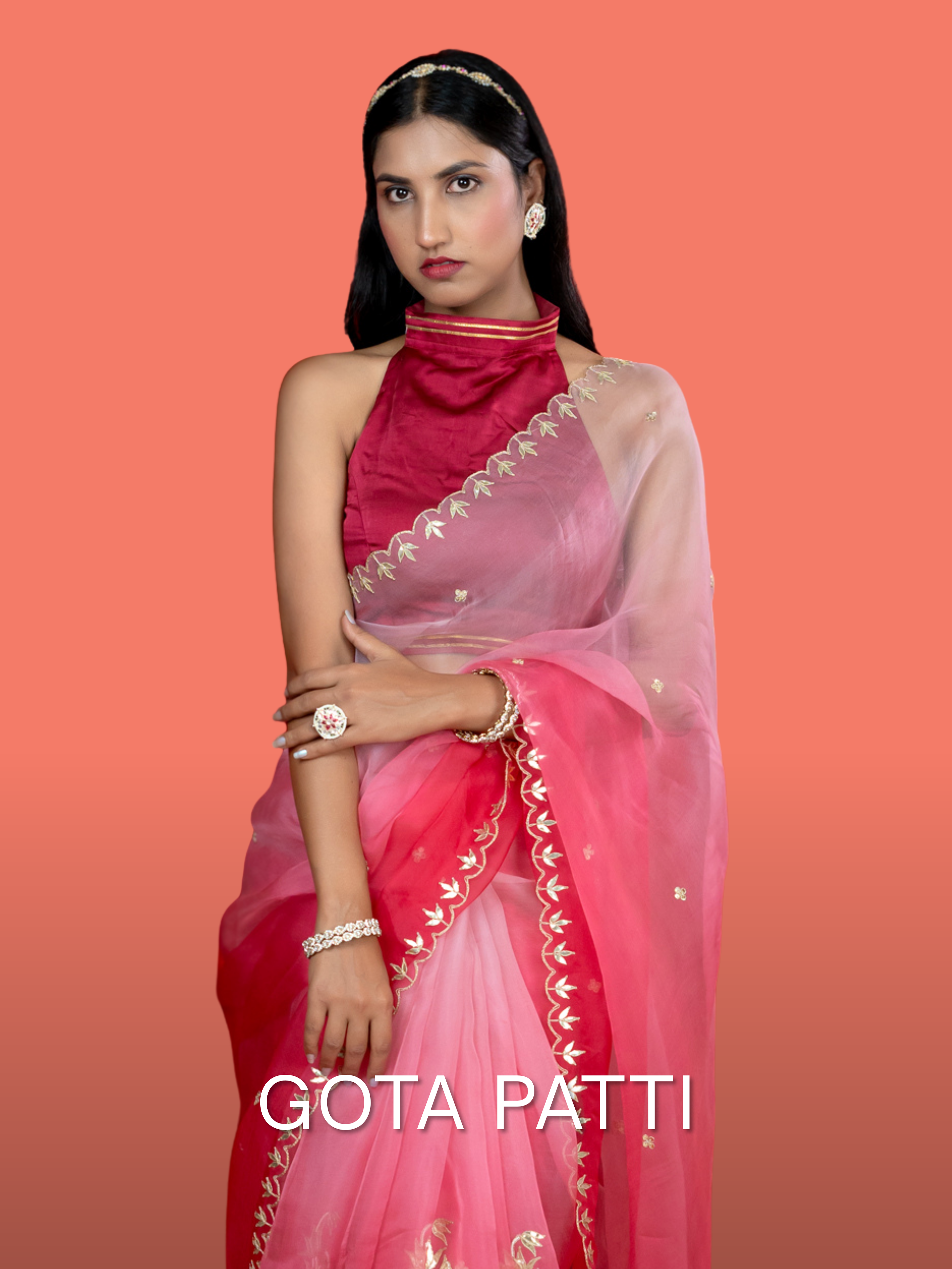 From the rich sheen of silk to the understated elegance of georgette and organza, every drape in this collection is chosen to embody celebration and sophistication. Each saree is delicately adorned with Gota Patti embroidery, reflecting the heritage of Rajasthan’s royal craft and adding a touch of regal charm to your festive wardrobe.
